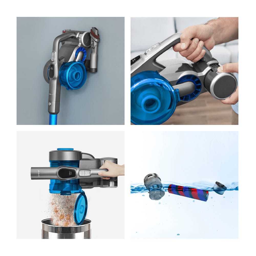 Jimmy JV85 выполнен таким образом, чтобы пользователь мог в любой момент разобрать пылесос и собрать обратно. Все его элементы можно промыть под водой. Настенное крепление выступает в качестве зарядной станции.